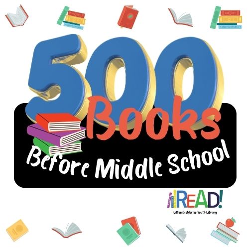 Lillian DesMarias Youth Library is challenging all Kindergarten-5th graders to read 500 Books Before Middle School. The goal is for you to develop a lifelong love of reading. There is no assigned reading, so you can read whatever you want during this program.